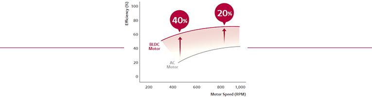 Motorul BLDC este mai eficient decit un motor conventional de aer conditionat , oferind pina la 40% eficienta energetica la viteze scazute si pina la 20% eficienta la viteze mari .