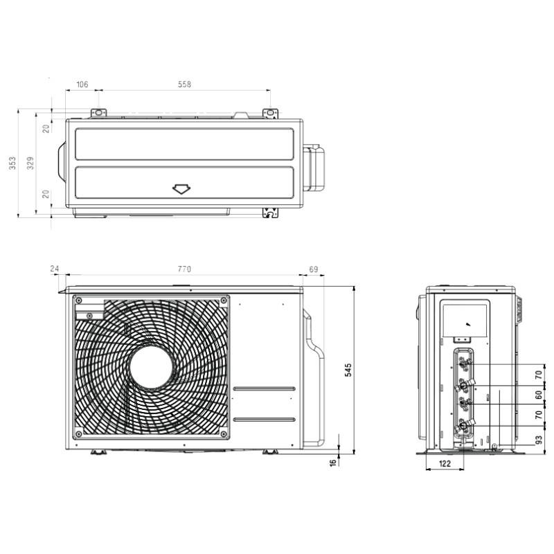 Noul model de grila de pe unitatea externa ajuta la dispersia mai eficienta a aerului si imbunatateste schimbul de caldura si in acelasi timp reduce si nivelul de zgomot . Noul model de ventilator axial are o margine frontala mai groasa si o margine exterioara mai subtire , asigurind eficienta mai buna si un nivel de zgomot mai redus , pe linga o imbunatatire a circulatiei aerului .