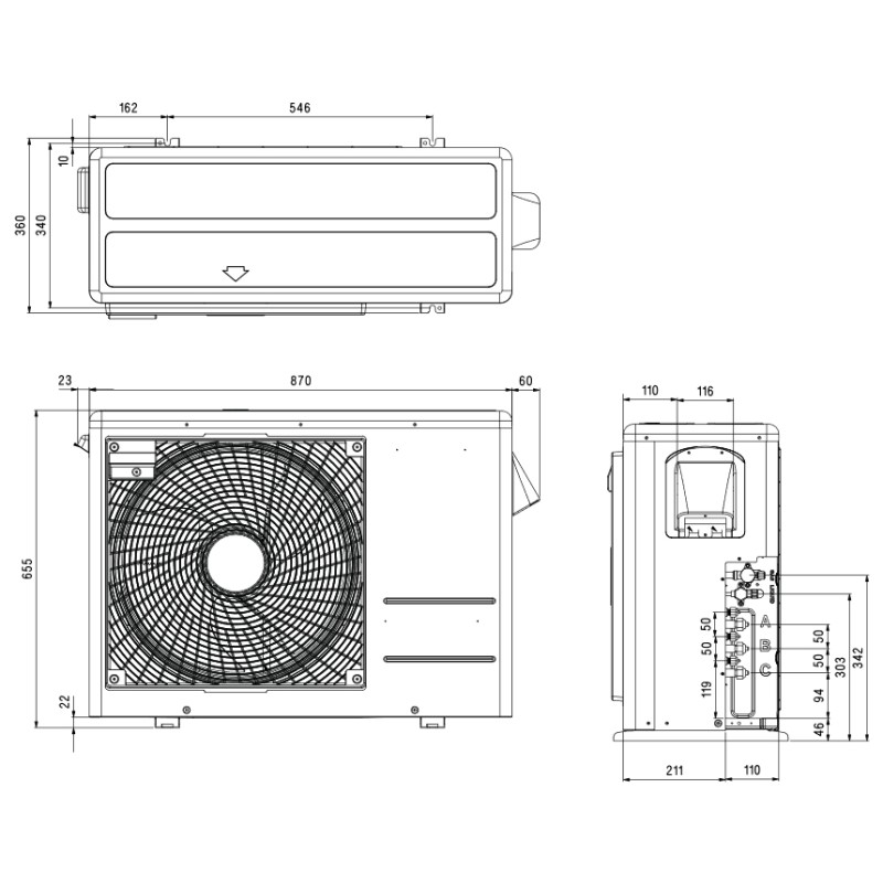 Noul model de grila de pe unitatea externa ajuta la dispersia mai eficienta a aerului si imbunatateste schimbul de caldura si in acelasi timp reduce si nivelul de zgomot . Noul model de ventilator axial are o margine frontala mai groasa si o margine exterioara mai subtire , asigurind eficienta mai buna si un nivel de zgomot mai redus , pe linga o imbunatatire a circulatiei aerului .