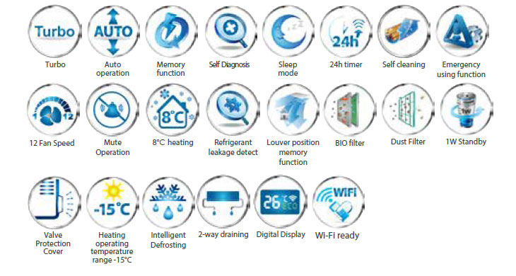 Design-ulspecial al schimbătorului de căldură oferă performanță ridicata. Compresorul cu eficiență de vârf in consumul energiei este un element esențial al tehnologiei. Designul prizei de aer asigura o ieșire optimă ce asistă eficienta energetica.