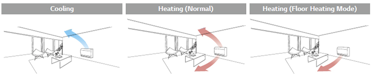 In timpul operatiunii de racire, baleiajul se ajusteaza in sus pentru a dirija fluxul de aer catre tavan.