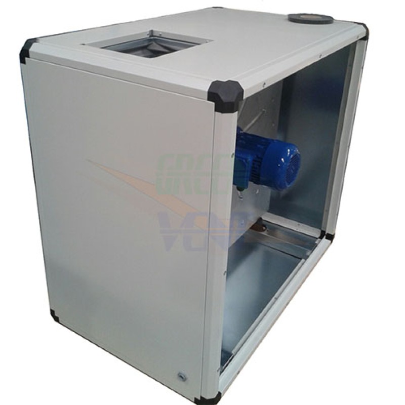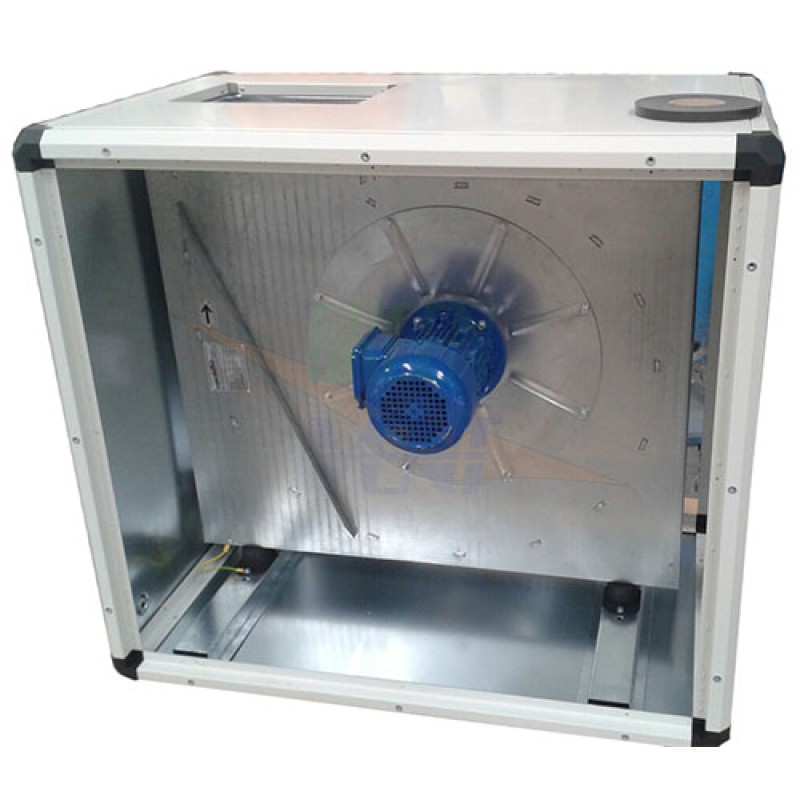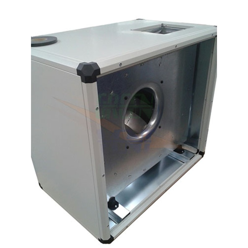 Ventilator centrifugal dublu aspirant, carcasat cu panouri metalice din otel vopsit in camp electrostatic, izolat fonic. Motor inchis, cuplat direct, avand elice cu pale tip backward curved anti acumulare grasimi, clasa de izolare electrica F si protectie IP 55.